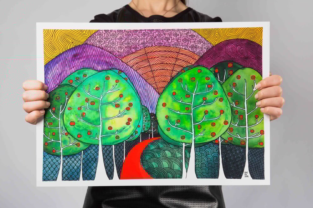 This is a signed giclée print from original ink and watercolour illustration 'Apple Aisle' by Em In Ink.